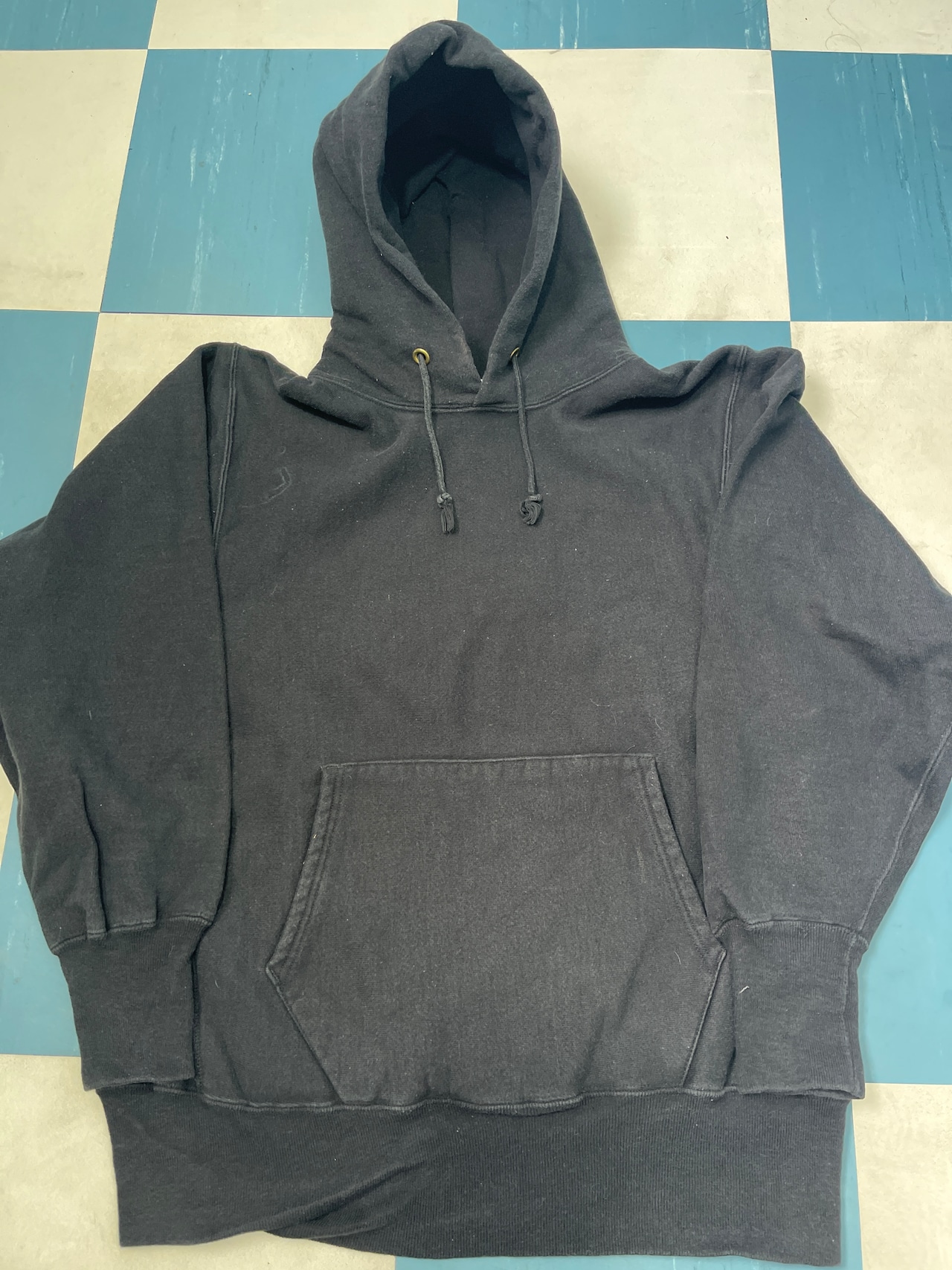 90s L 極上 BLACK CHAMPION REVERSE HOODY 黒色 目無し リバースパーカー バックプリント 1334