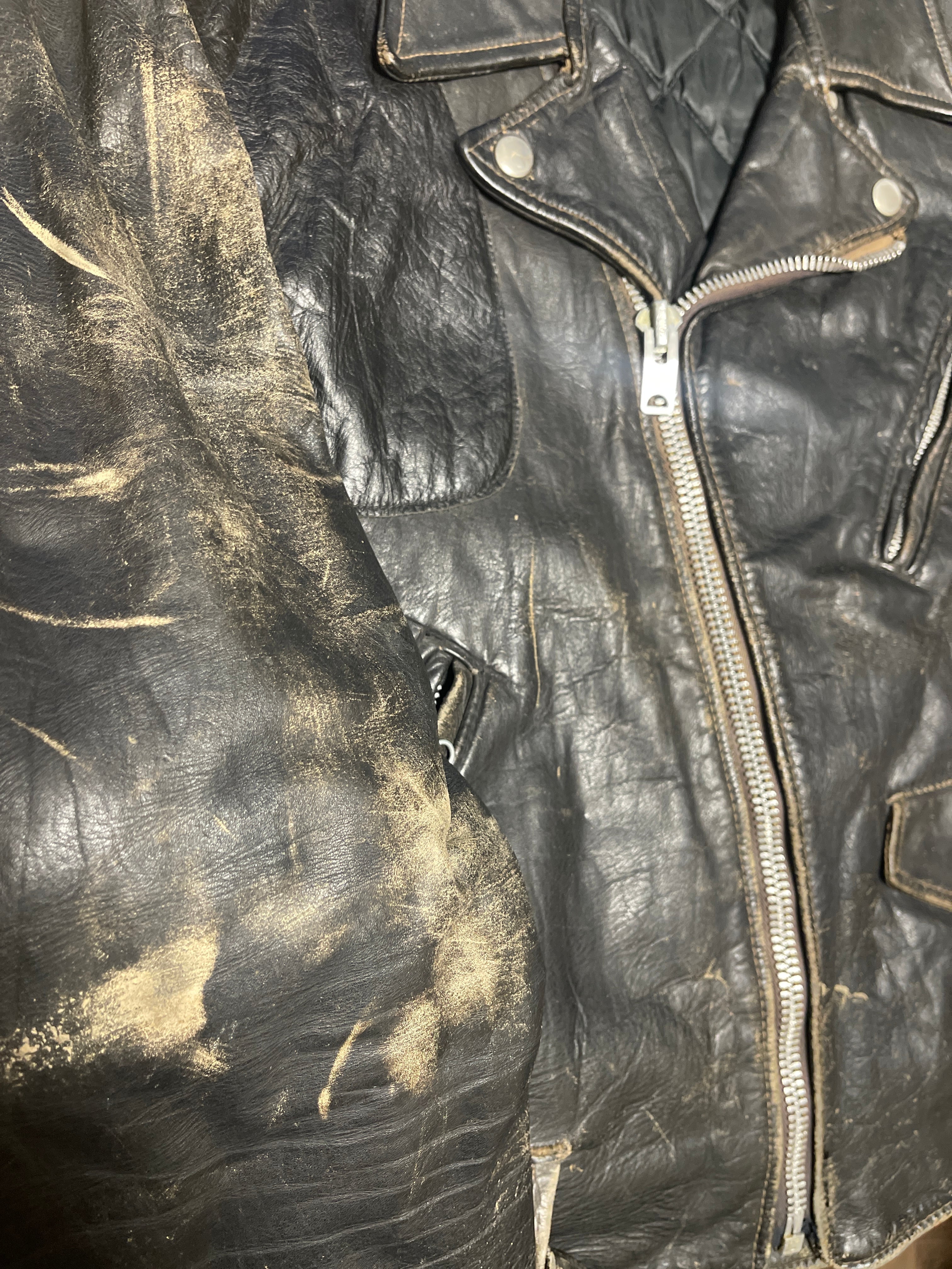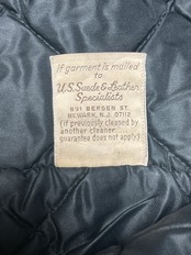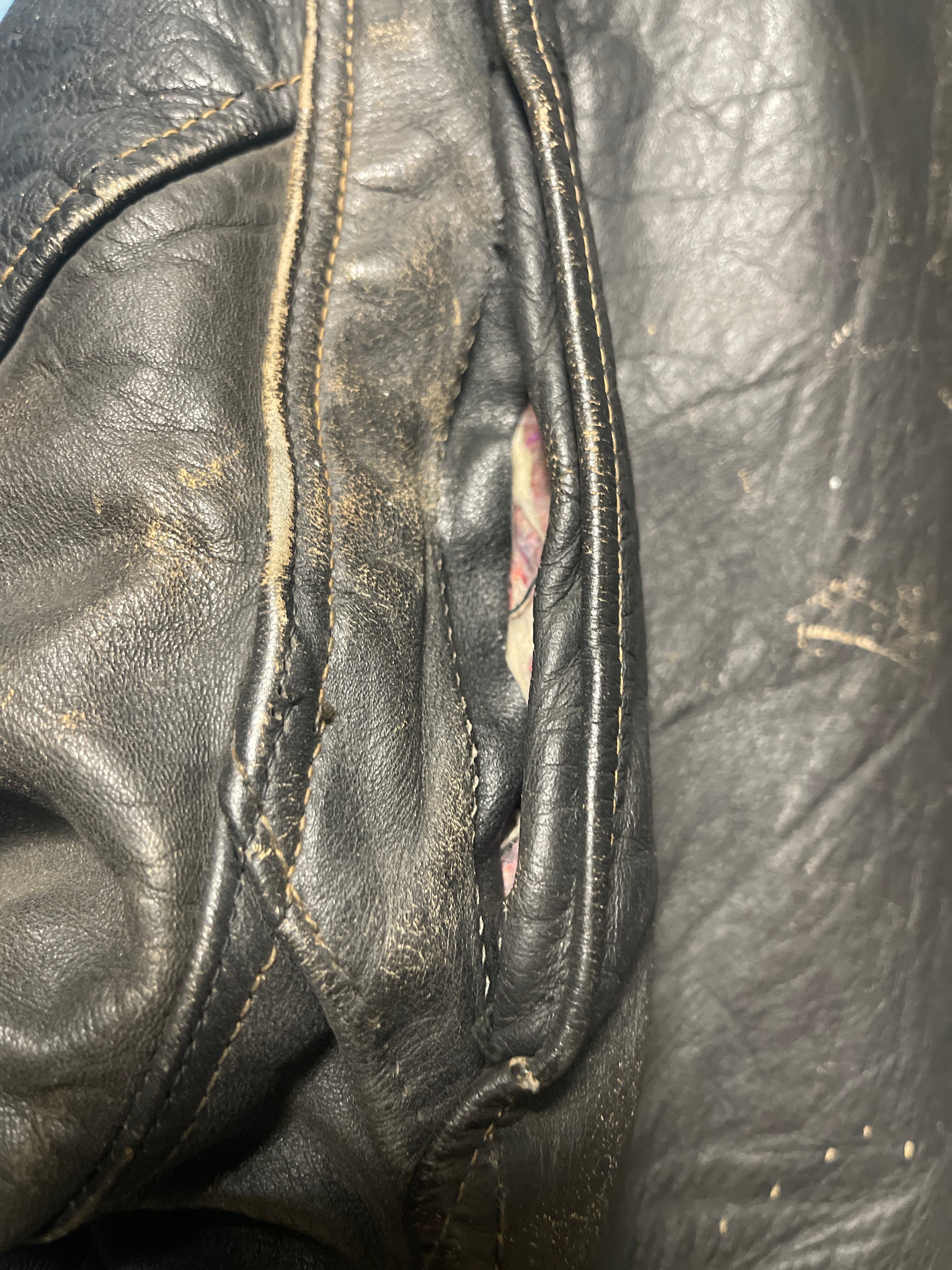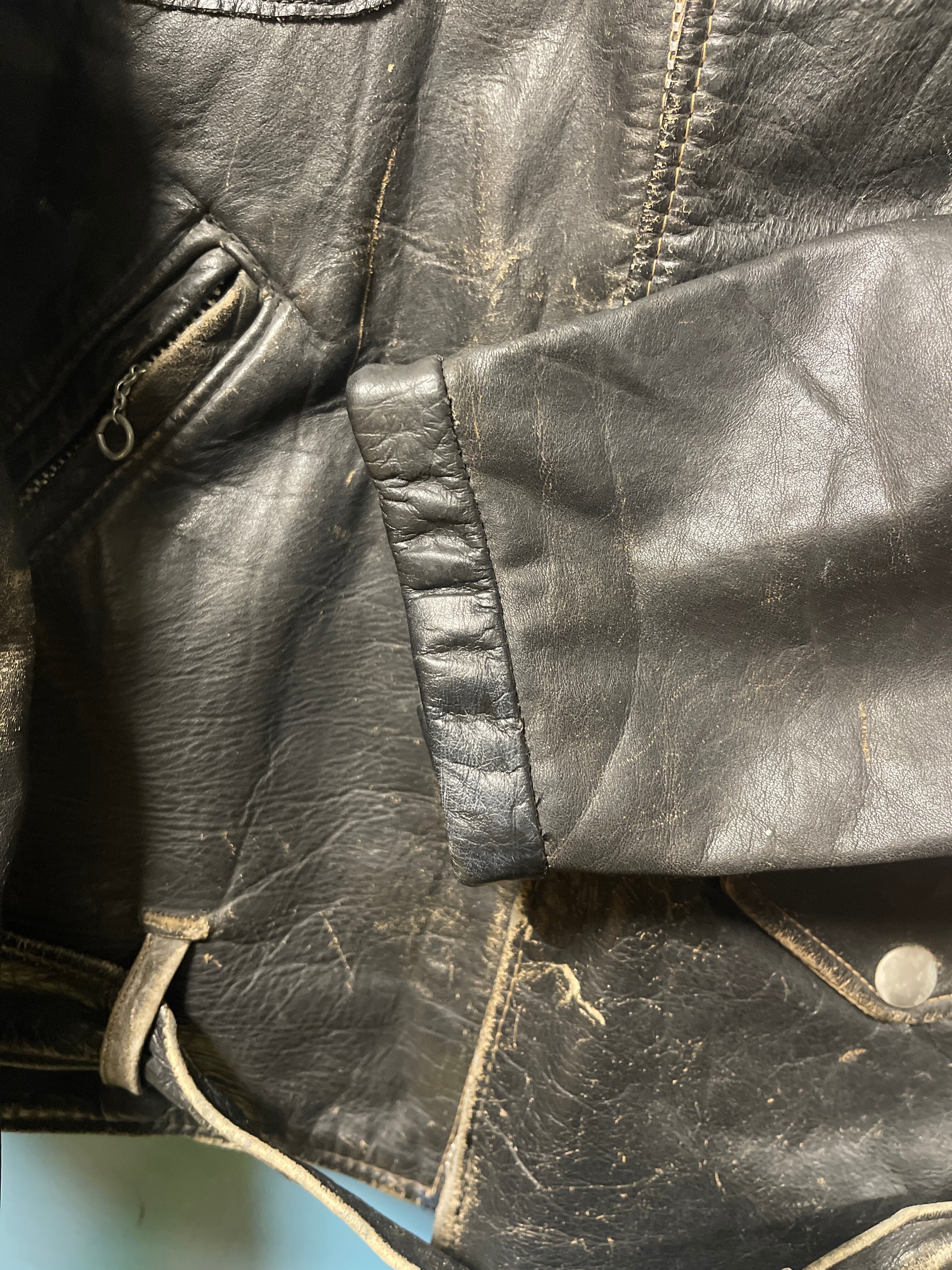 CONDITION : 使用感があり、小傷、汚れ等ございます。裏地に多少のダメージあり。かなり着込んだ感があり、後ろ肩下ほつれ、違和感のない右胸から肩にかけて革の補強、左袖先の革の補強、裏地に内ポケが作られています。ジップはすべて可動します。擦れ傷がかなり多めですが穴はありません。普通に着れると思います。