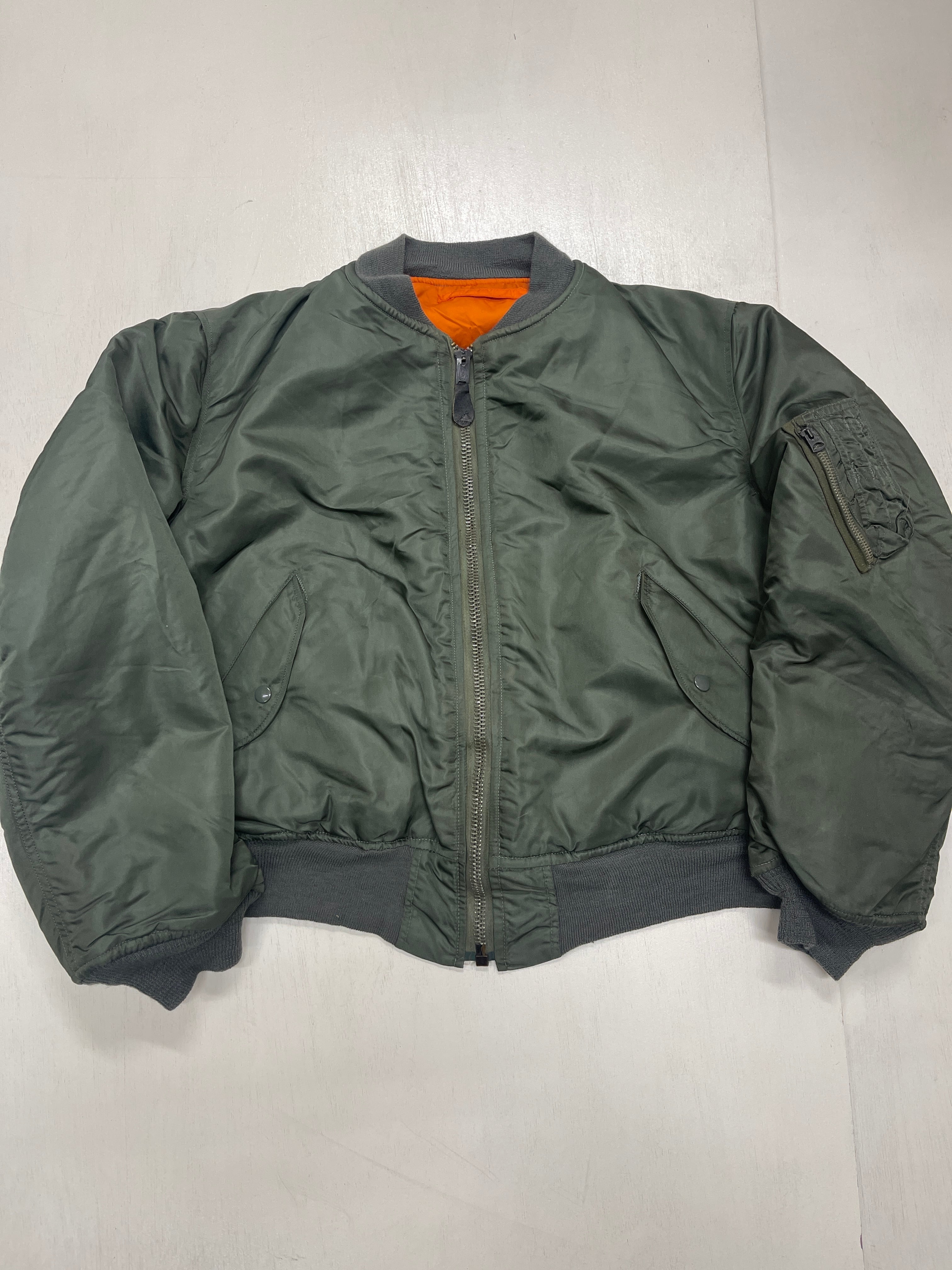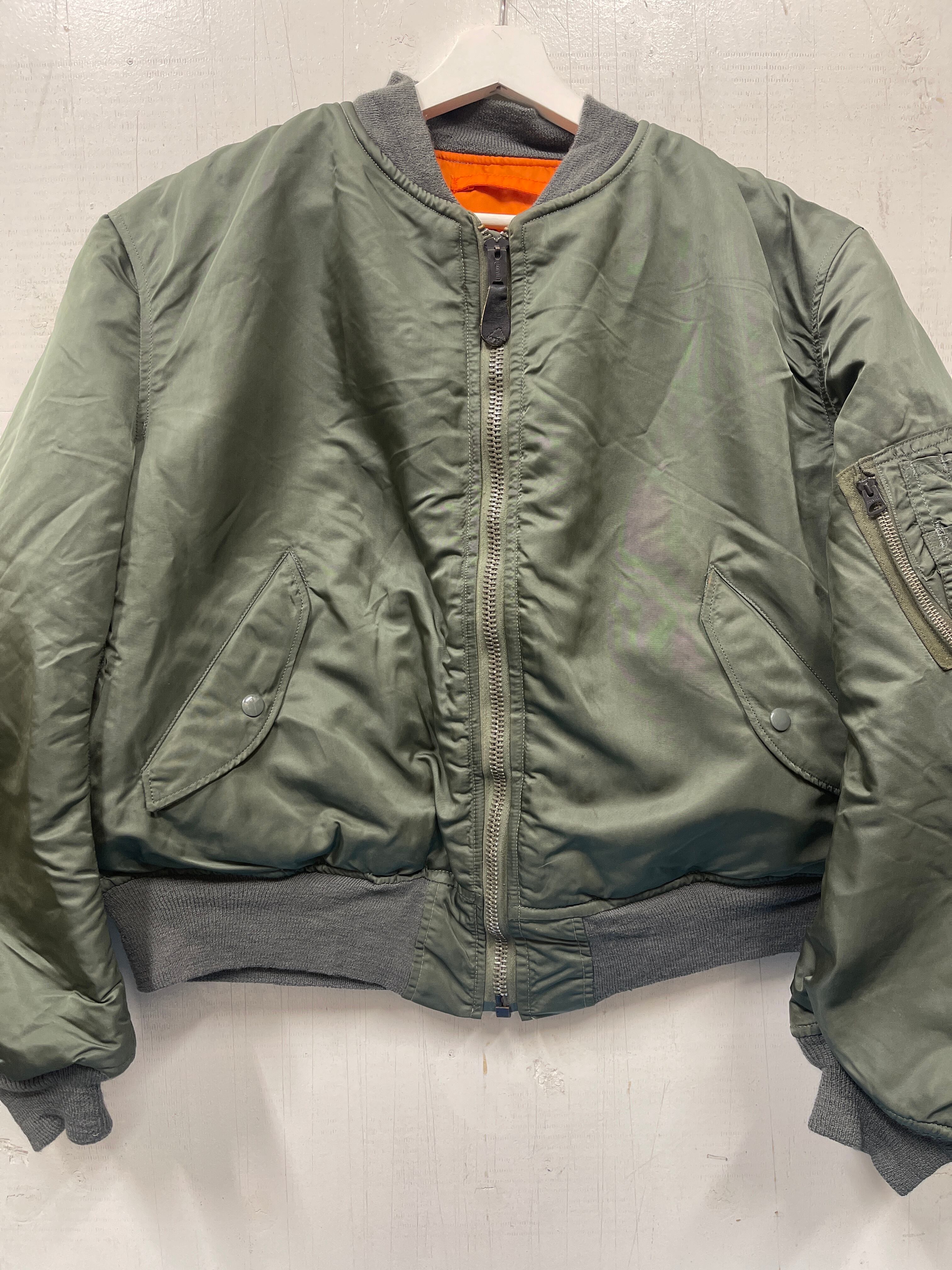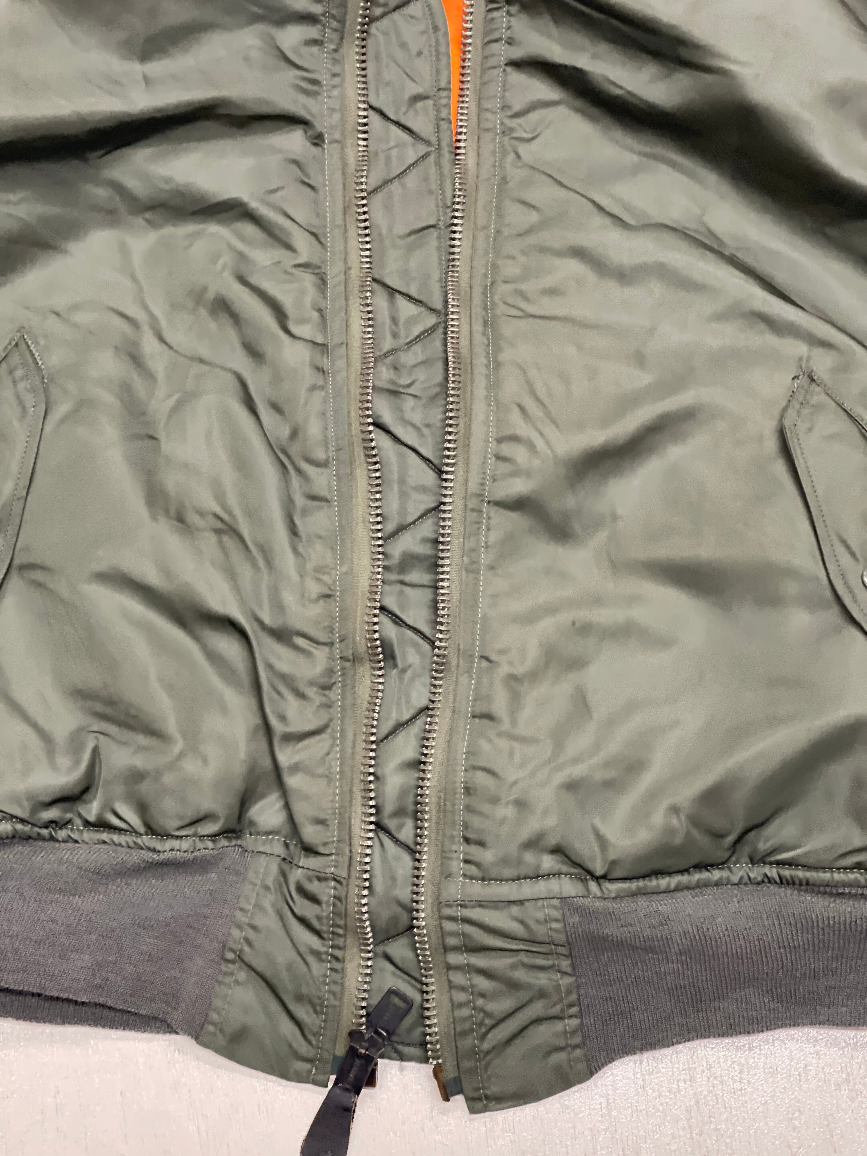 使用感があり、多少の汚れ、小傷、リブ多少のダメージなどがありますが比較的状態の良いMA-1ジャケットです。白タグは新品同様。アルファインダストリーズ社製。