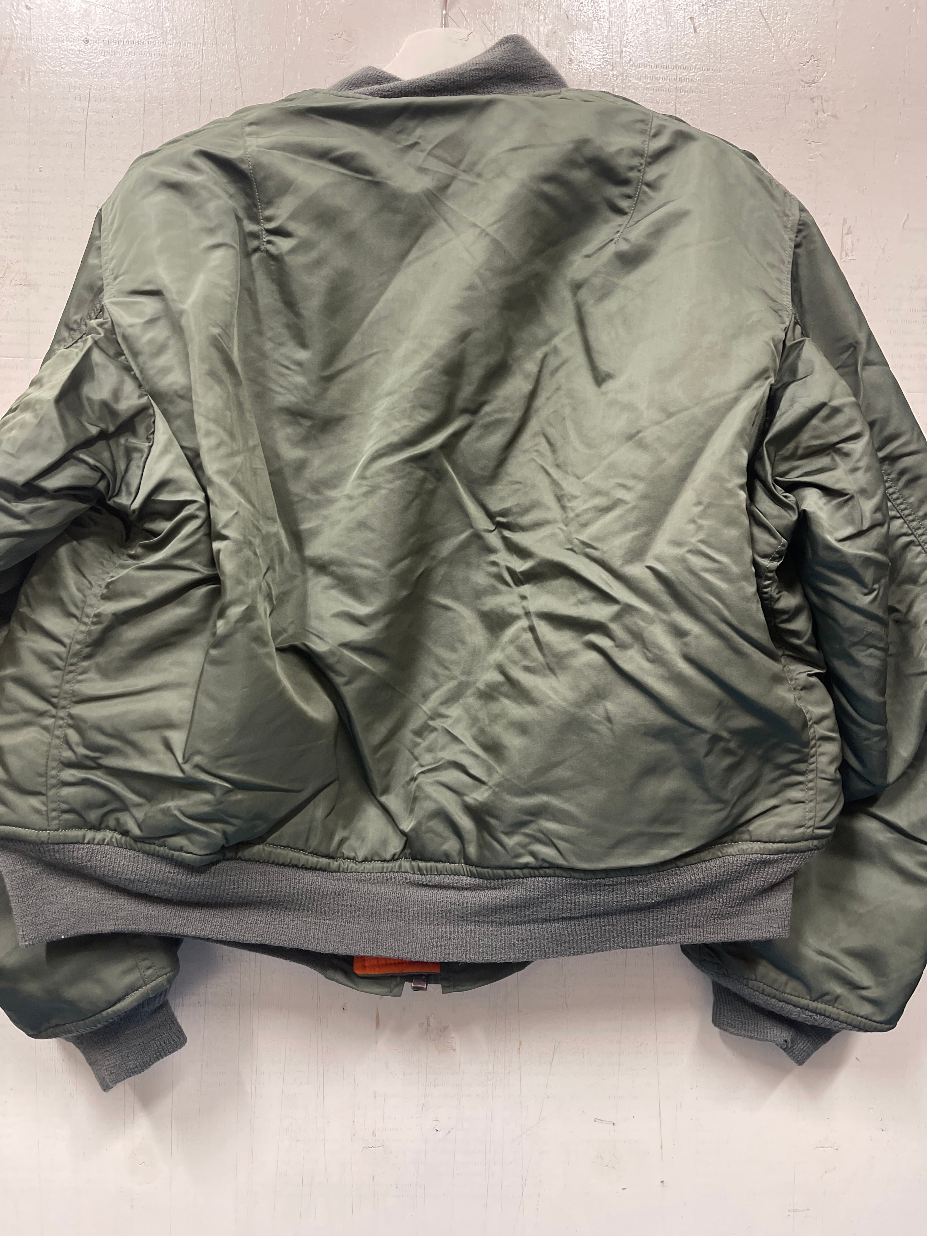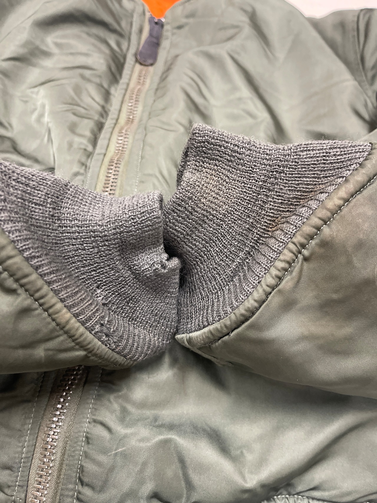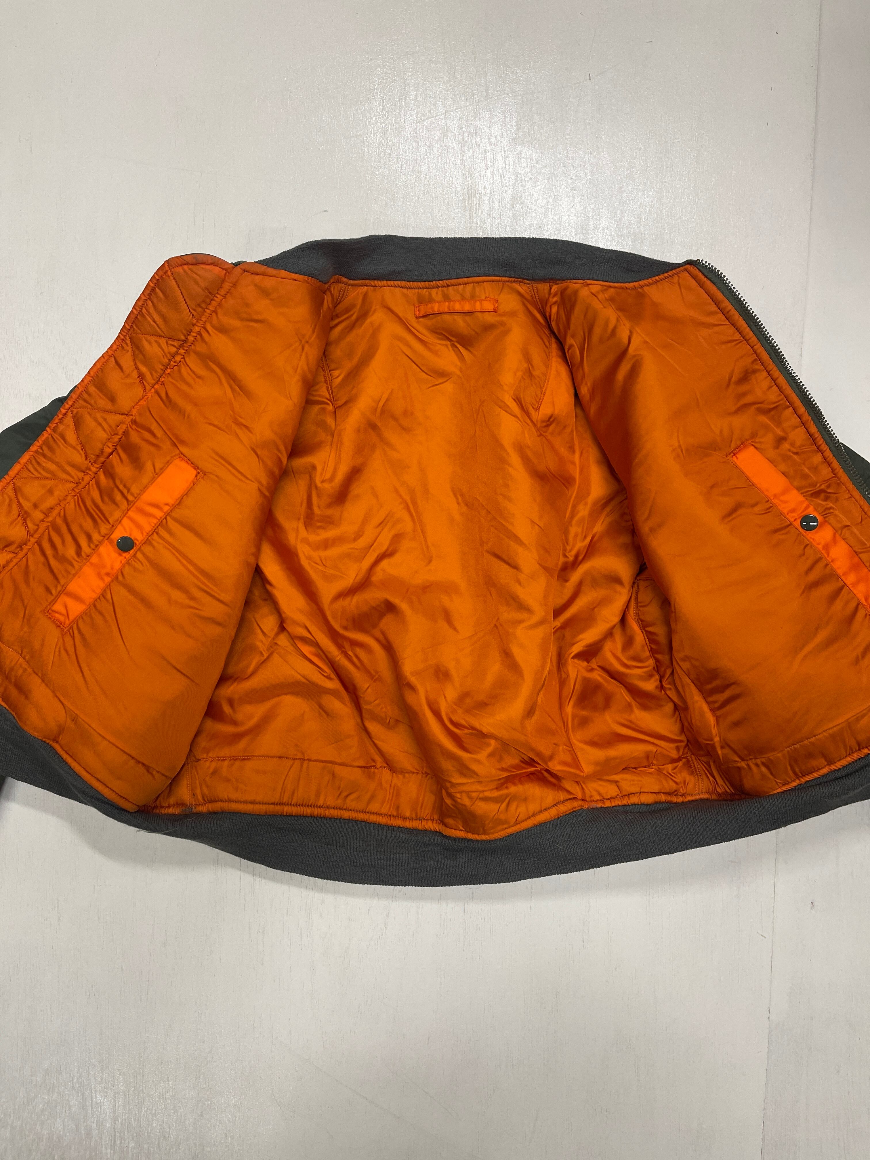 使用感があり、多少の汚れ、小傷、リブ多少のダメージなどがありますが比較的状態の良いMA-1ジャケットです。白タグは新品同様。アルファインダストリーズ社製。
