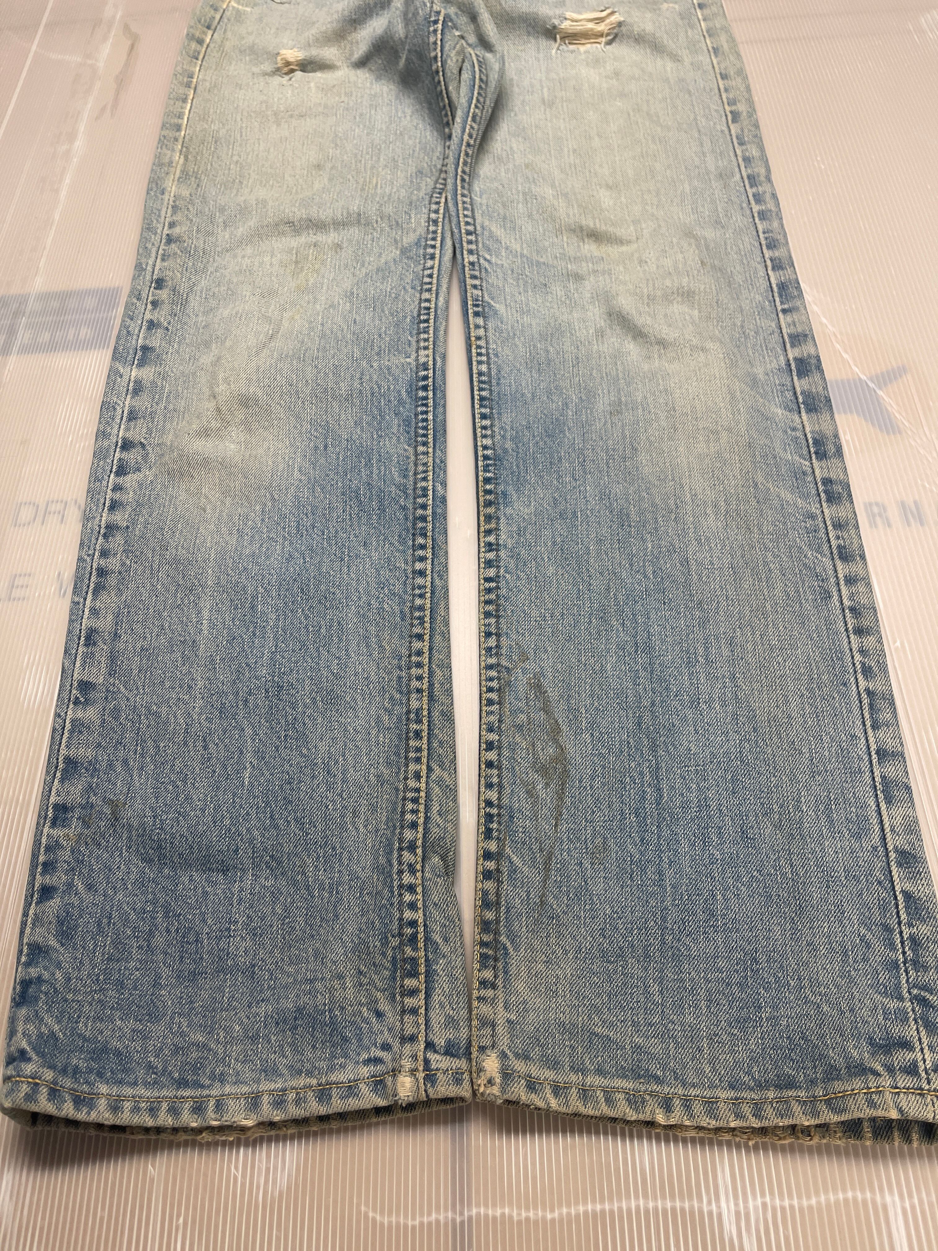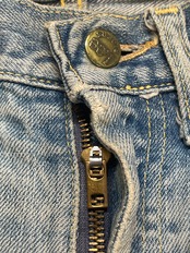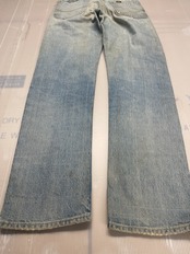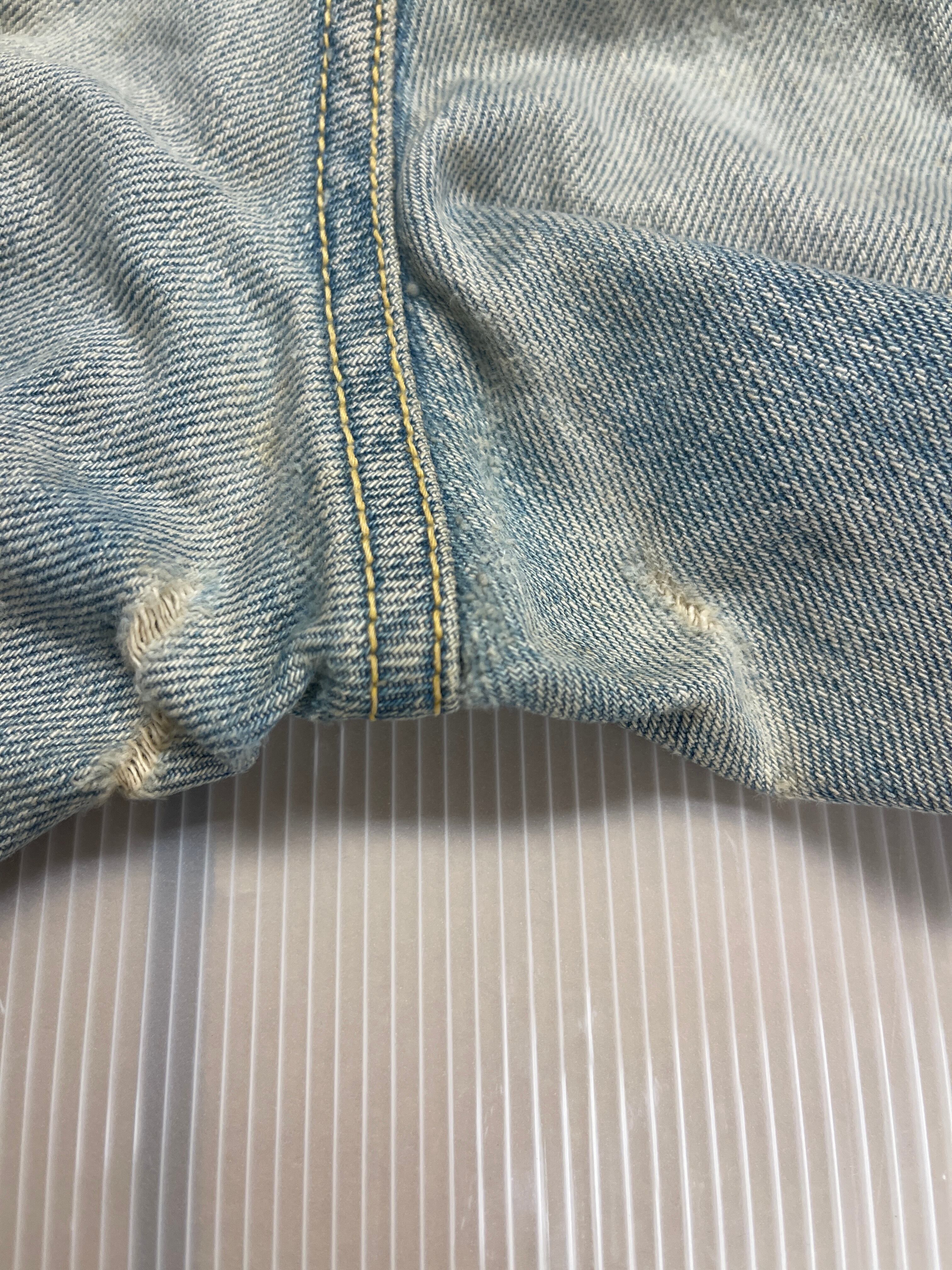 使用感があり,汚れ、小穴、擦れ、股部、裾部、その他のダメージなどがあります。色は薄いですが縦落ちした雰囲気の良いダメージジーンズです。TALON ZIP.